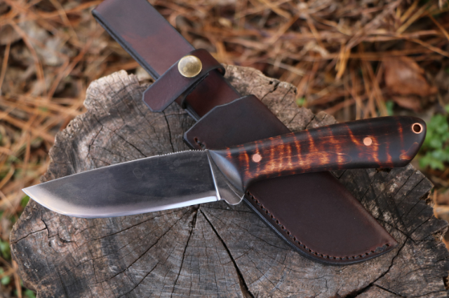 This Mini Jaguar has a beautiful curly maple handle, 3/16″ copper pins, and a snap sheath!