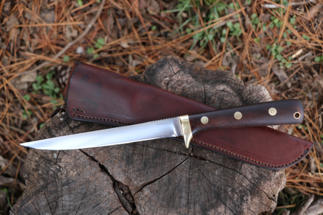 This slender ProSkinner-style fillet knife, with a brass guard, is ideal for working up fish, or for keeping handy when grilling meats!